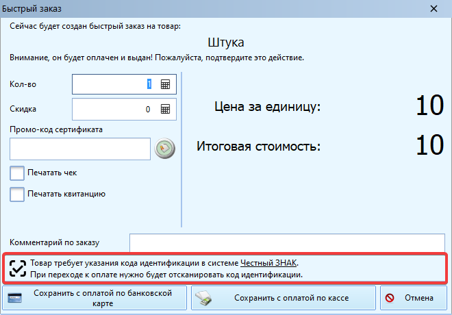 == Быстрый заказ == При оформлении быстрых заказов для товаров требующих маркировку будет также добавлен дополнительный пункт для необходимости проведения сканирования штрих-кода маркировки.