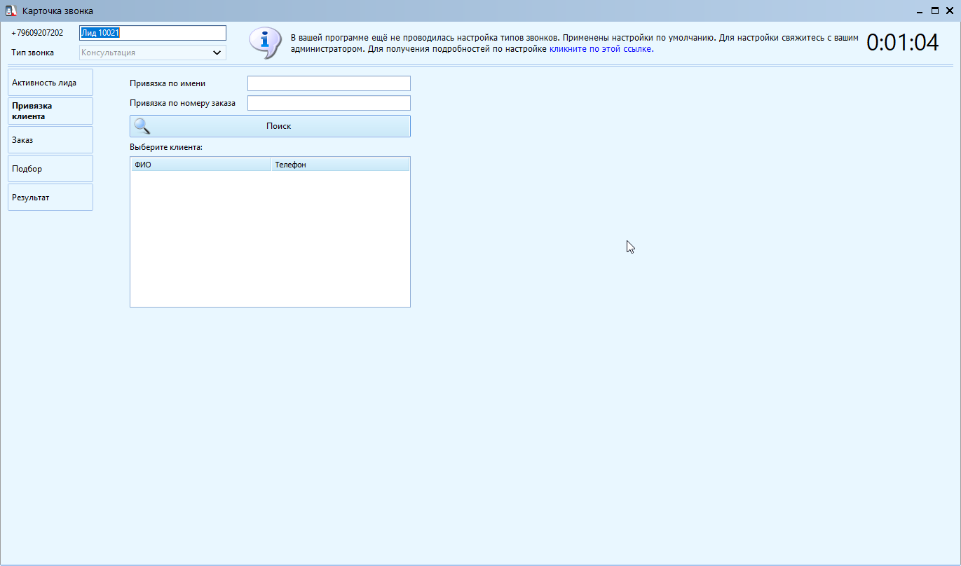3. Область с предупреждением. Если отображается данное сообщение, то, скорее всего, модуль Call-центра был недавно приобретен или недавно происходило обновление программы. Оно уведомляет о том, что не происходила настройка типов звонков и их результатов. Настройка типов звонков будет описана ниже. Программа считает проведением настройки сохранение хотя бы одного типа звонка. После проведения настройки нужно подождать минут 20-30 (пока придёт репликация), и перезапустить модуль Call-центра, чтобы это сообщение пропало.