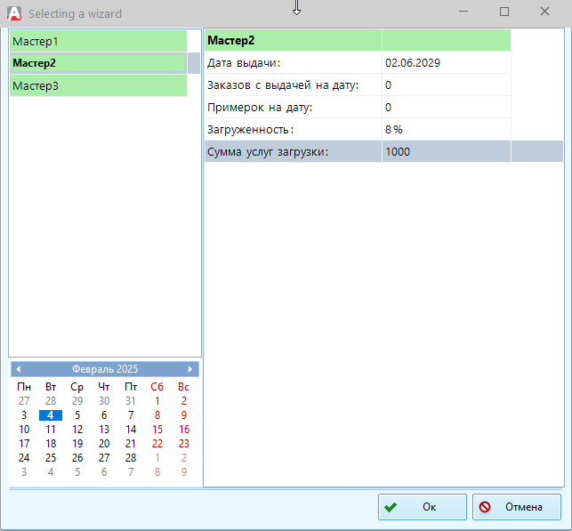 Для выбора мастера-исполнителя в рамках заказа добавили форму «Выбор мастера», в которой формируется список пользователей по складу приема заказа и сортируемые в зависимости от загрузки на выбираемую в форме дату.