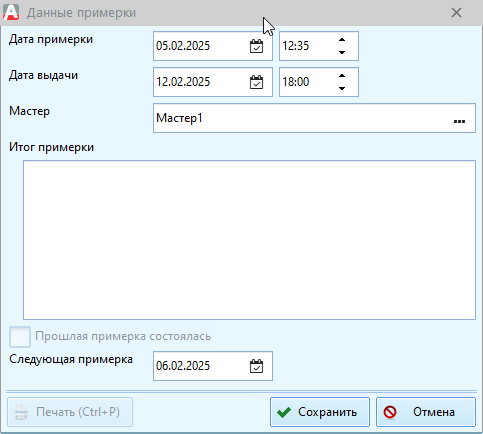 - «Итог примерки» - текстовое описание с пояснением проведенной примерки.