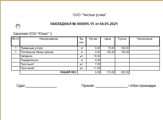 Вид данной накладной может быть модифицирован под необходимый стандарт прачечной.