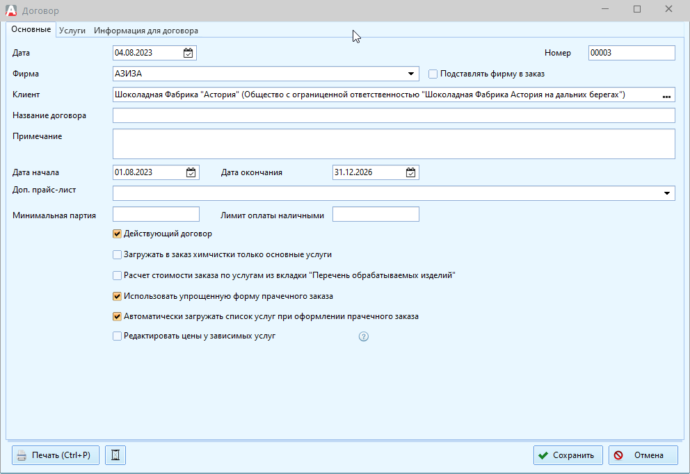 Примерный вид договора отражен ниже: в левой колонке добавляется основная оказываемая услуга, а справа - перечень обрабатываемых изделий.