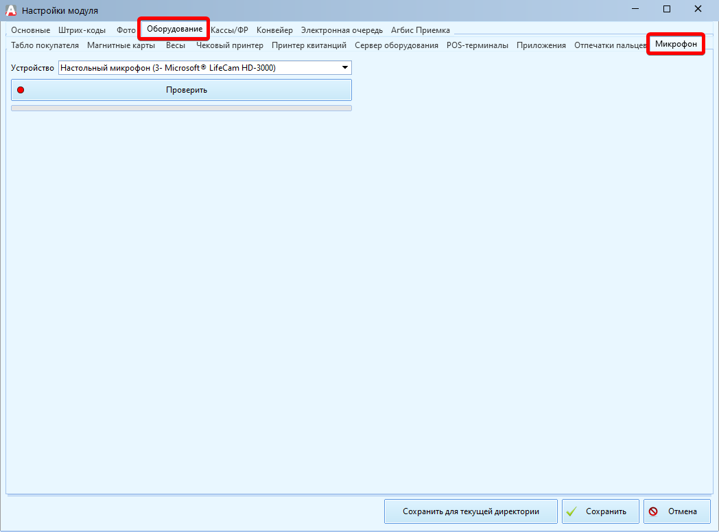 Выбор записывающего устройства находится: Файл - Локальные настройки - Оборудование - Микрофон. В данном окне можно выбрать доступный микрофон и тут же провести его тестирование.